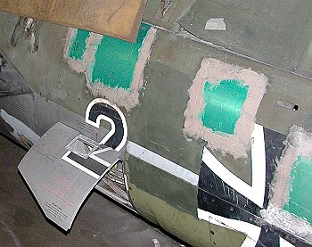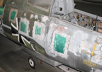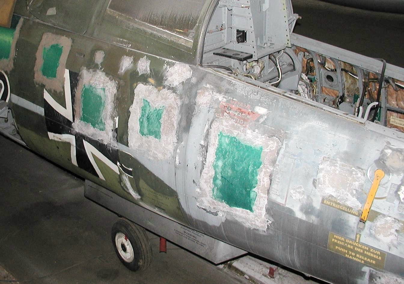Vorne rechts: Man sieht das geplünderte Cockpit. Die Bleche sind schon verspachtelt und verschliffen. Es fehlt nur noch der Feinschliff und der Füller. | |